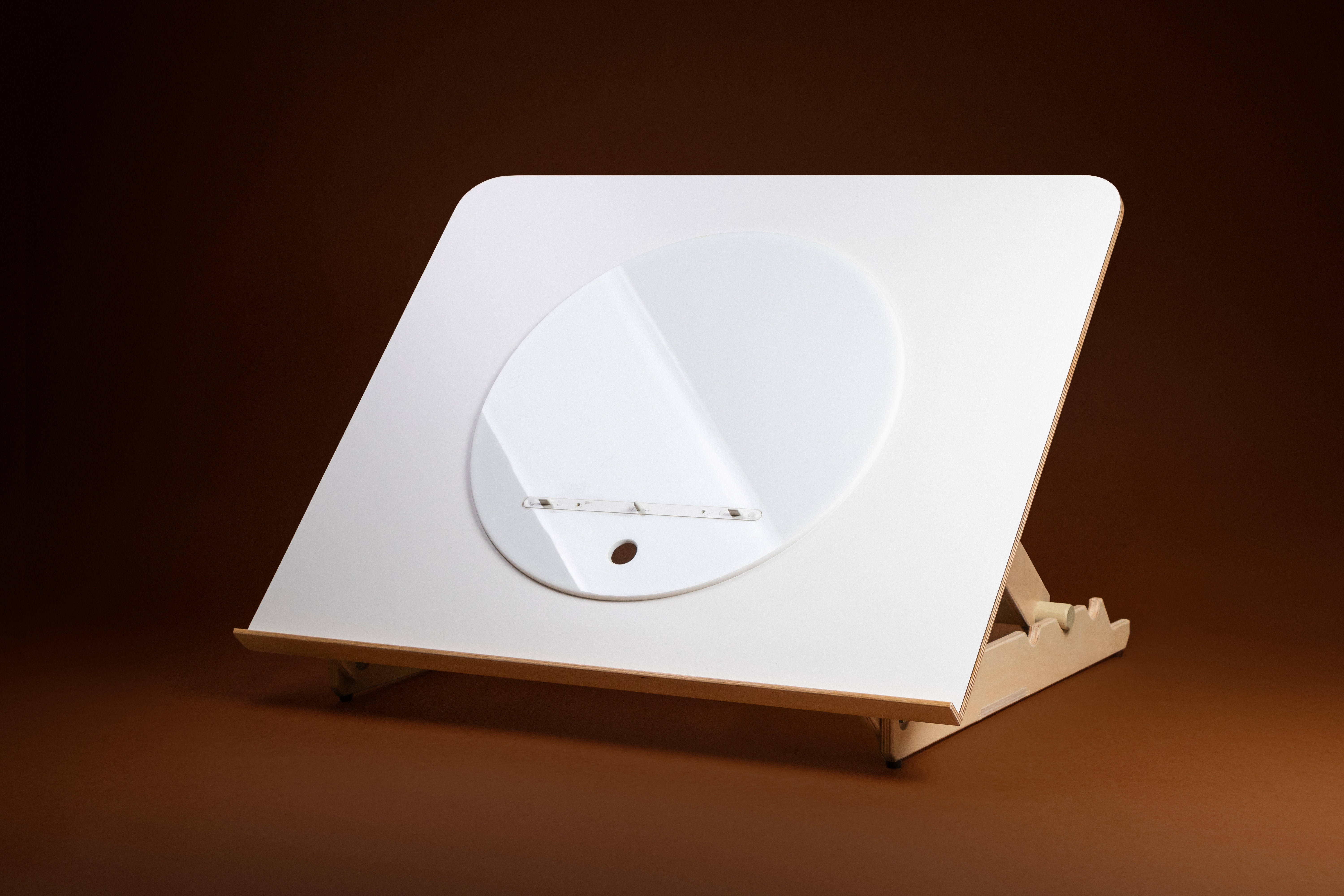 The animation desk combines functionality and style, designed specifically for animators. It features improved LED lighting for a brighter work surface and a rotating Plexiglass disk with tabs and a recessed peg bar for smooth and secure spinning. The desk adjusts to 30°, 45°, or 60° angles for optimal drawing comfort. Key features include non-slip rubber feet to protect furniture, a pencil ledge for tool storage, and a sturdy 24” x 30” high-density plywood top. The LED light offers two brightness settings (soft and bright) and is powered by a standard type A plug. For convenience, the desk folds down to just 4” tall for easy storage.